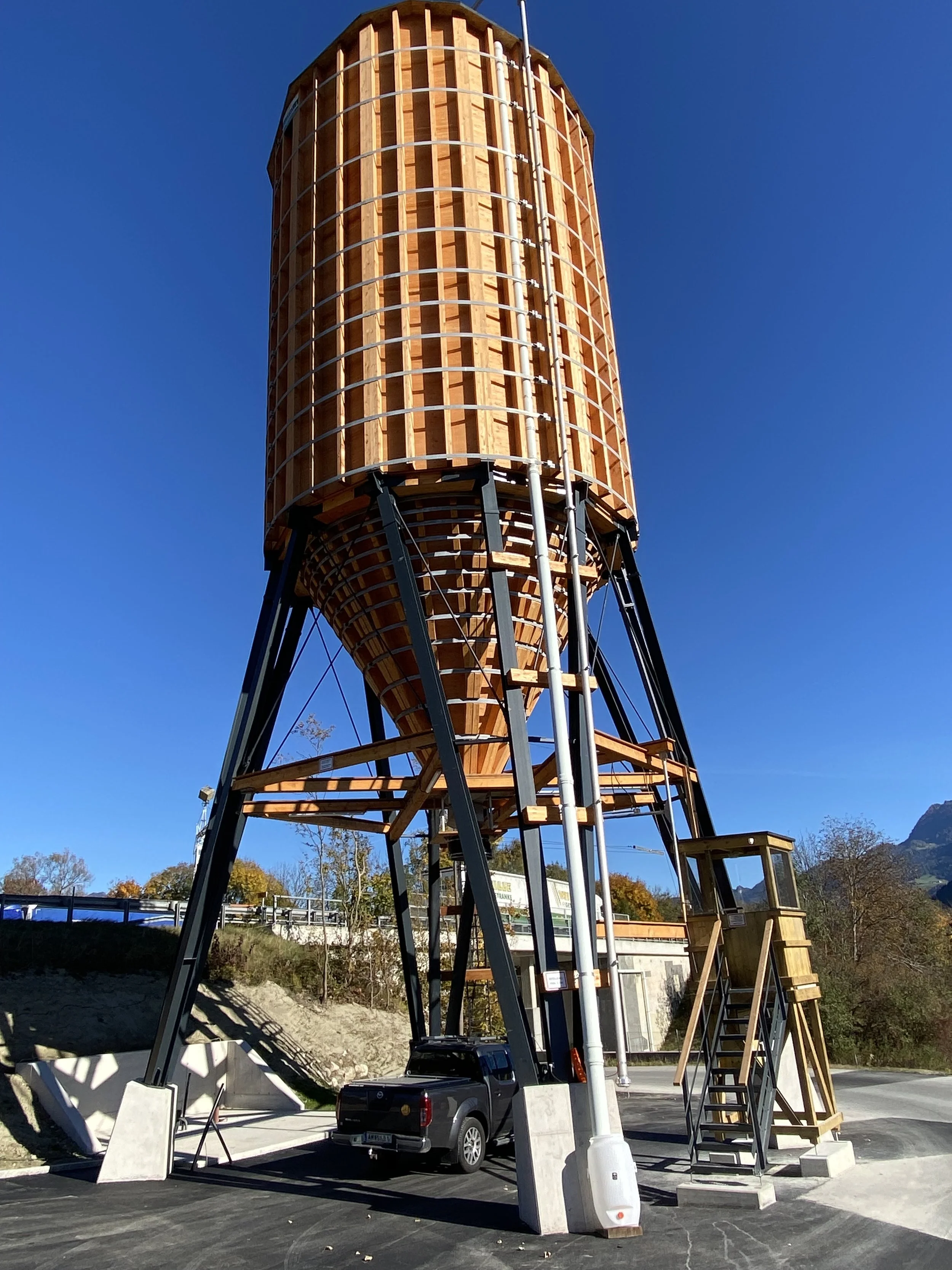 Der Alpensilo zeichnet sich aus, durch seine vieleckige Bauform. Das Regenwasser wird zur Gänze abgeleitet. Das manuelle oder pneumatische öffnen, das aus Edelstahl produzierten Doppelsegmentschieber fördert das Auftausalz rasch in das Streufahrzeug.